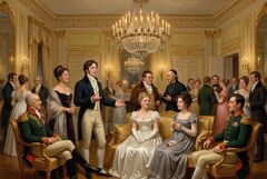 В гостиной фрейлины постепенно собралась высшая знать. Приехали дети князя Василия. Появилась беременная княгиня Лиза Болконская.