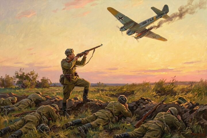 И тогда один боец встал с колена и выстрелил по самолёту из винтовки. Это был Василий Тёркин.