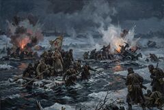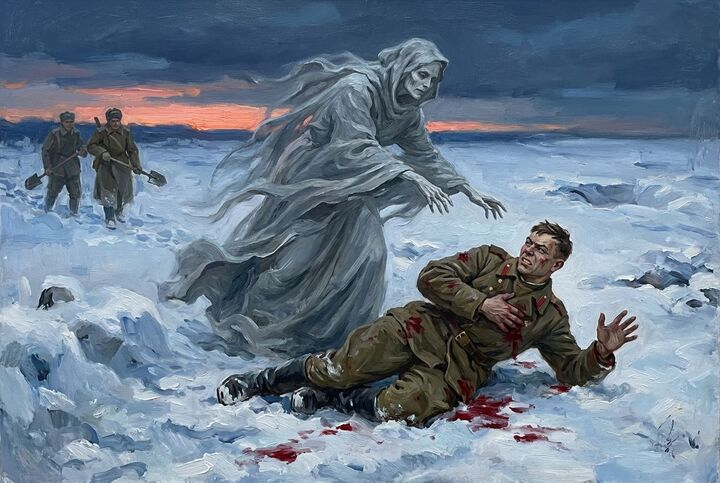 Снег под ним пропитался кровью и превратился в ледяную глыбу. К раненому пришла Смерть и позвала его с собой, пообещав избавление от всех тяжестей войны.