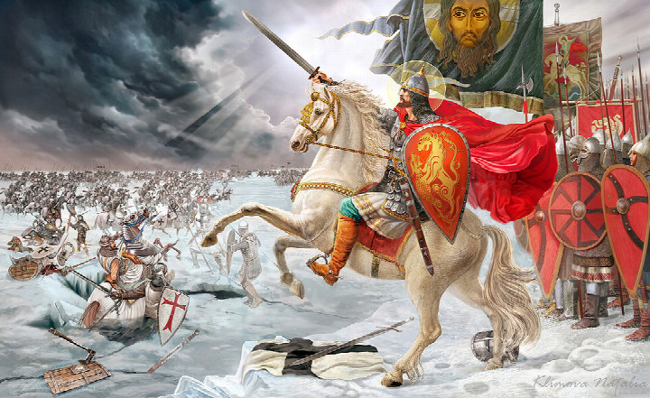 Битва произошла на Чудском озере. Лёд там покрылся кровью. Очевидцы рассказывали о воинстве Божием в воздухе, которое помогало Александру.
