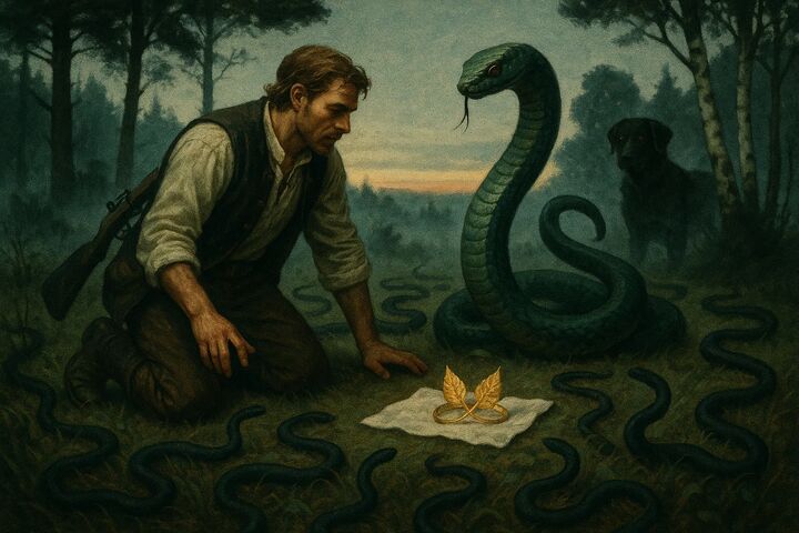 Охотника преследовали неудачи на охоте. Лесной колдун посоветовал ему добыть корону змеиного царя. После этого охотнику долго везло. Везение закончилось, когда он поцеловал освящённый крестик.