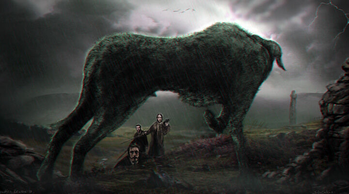 В давние времена один из предков Чарльза Баскервиля, владелец поместья Гуго, отличался необузданным и жестоким нравом. Воспылав нечестивой страстью к дочери одного фермера, Гуго похитил её. Заперев девицу в верхних покоях, Гуго с приятелями сел пировать. Несчастная решилась на отчаянный поступок: она спустилась из окна замка по плющу и побежала через болота домой. Гуго бросился за ней в погоню, пустив по следу собак, его товарищи — за ним. На широкой лужайке среди болот они увидели тело беглянки, умершей от страха. Рядом лежал труп Гуго, а над ним стояло мерзкое чудовище, похожее на собаку, но гораздо крупнее. Чудовище терзало горло Гуго Баскервиля и сверкало горящими глазами. И, хотя записавший предание надеялся, что провидение не станет карать невинных, он все же предупреждал своих потомков остерегаться «выходить на болота в ночное время, когда силы зла властвуют безраздельно»,