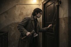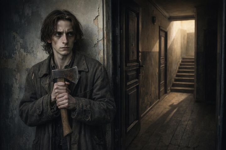 Спускаясь по лестнице, он чуть не наткнулся на возвращавшихся клиентов и успел спрятаться в квартире, где шёл ремонт. Вернувшись домой, он положил на место топор, заперся в своей каморке и впал в забытьё.