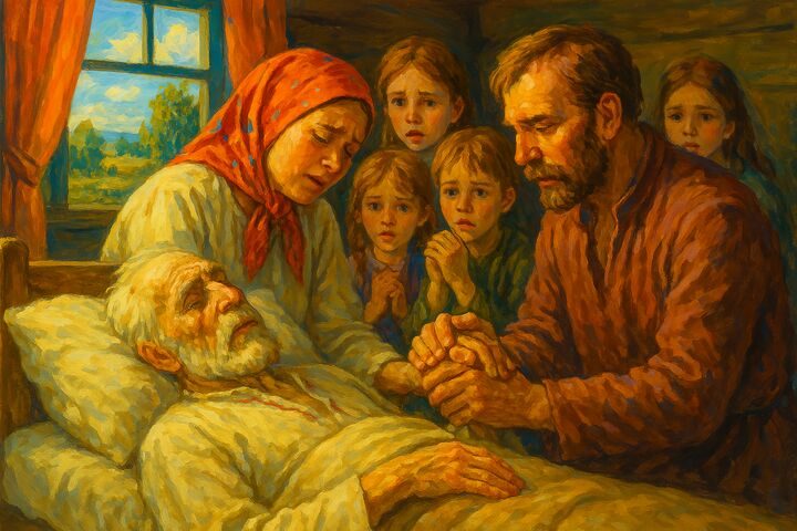 С рыбалки вернулся Антось. Дети бросились было к дяде, но увидели, что он молится, и не стали его отвлекать от разговора со святыми. Чуть позже домой вернулся Михал. Ганна накрыла стол, и все сели обедать.