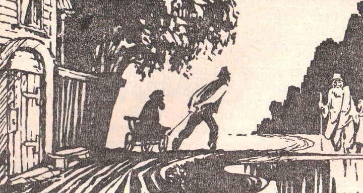 Мама братьев накормила феномена и Матвея обедом. Мальчики видели, как Матвей уходил по переулку, таща за собой тележку с феноменом. Им встретился старик-нищий с маленькой девочкой, и Ян, преодолев сопротивление спутника, отдал ему серебряную монету.