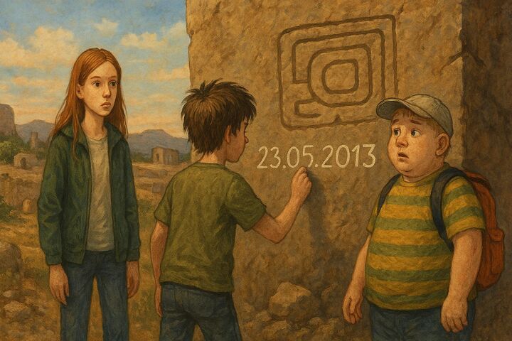 Юра встал и пошёл дальше. Оставалось всего семь минут, и ребята перешли на бег. Глеб добежал первым и нацарапал дату — «23.05.2013», друзья догнали его и в последний момент прыгнули в раскоп. Глеб исправил символ «конец» на символ «начало». По радио объявили, что наступила полночь.
