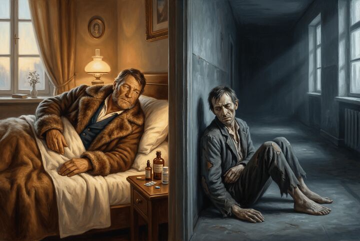 …а потом оба вместе взялись и положили на перину и сверху шубой покрыли и оставили потеть, а чтобы ему никто не мешал, по всему посольству приказ дан, чтобы никто чихать не смел.