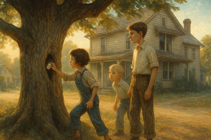 Осенью Глазастик пошла в школу. Теперь ей каждый день приходилось ходить мимо «проклятого дома». Возле дома росли высокие виргинские дубы. Однажды Глазастик нашла в дупле одного из дубов пакетик жвачки, а чуть попозже — коробочку с двумя «счастливыми» пенни. От кого эти подарки, дети только догадывались.