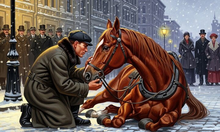 Лошадь упала на обледенелой улице. Толпа зевак посмеялась над ней. Мужчина подошёл к животному, увидел её слёзы и утешил, сказав, что даже люди устают. Лошадь встала и ушла, обретя новые силы жить.