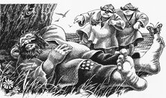 Но как только М. вылез из лодки, на него набросился медведь. Барон так сильно сжал его передние лапы, что тот заревел от боли. М. держал косолапого 3 дня и 3 ночи, покуда тот не умер от голода, так как не мог сосать лапу. С тех пор ни один медведь не решался напасть на находчивого барона.