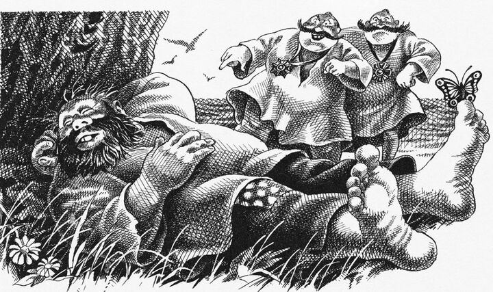 Генералы приуныли, и тут того, что служил учителем каллиграфии, осенило: надо найти мужика, который их обязательно накормит. Известно, что мужики есть везде, надо только хорошо поискать. Пустились генералы на поиски и нашли огромного мужчину, который спал под деревом и отлынивал от работы.