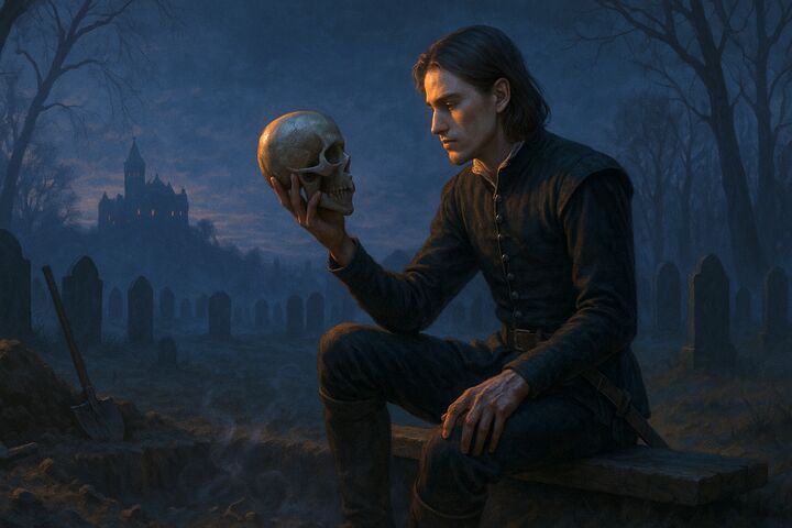 Гамлет прогуливается в одиночестве и произносит, размышляя, свой знаменитый монолог: «Быть или не быть — таков вопрос...» Почему мы так держимся за жизнь? В которой «глумленье века, гнёт сильного, насмешка гордеца». И сам отвечает на свой вопрос: «Страх чего-то после смерти — / Безвестный край, откуда нет возврата / Земным скитальцам» — смущает волю.
